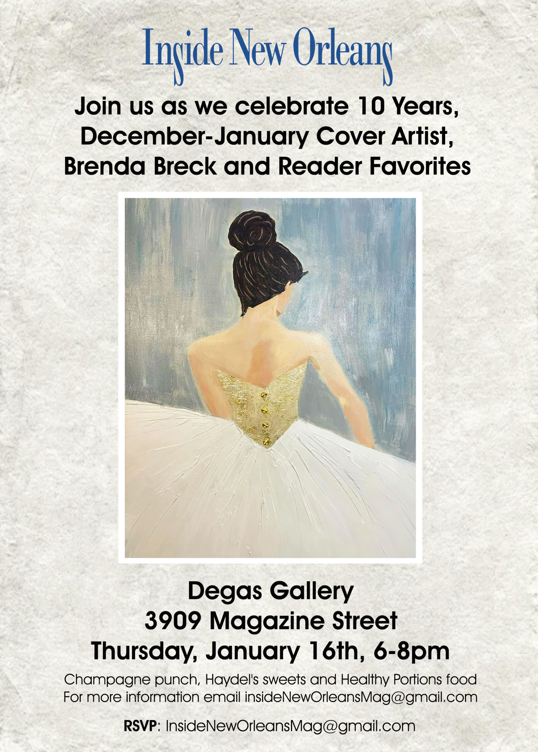 Make sure to Mark your Calendars to Celebrate 10 Years of Inside New Orleans Magazine+ Brenda Breck Art on JANUARY 16th back at DEGAS GALLERY on Magazine!!!